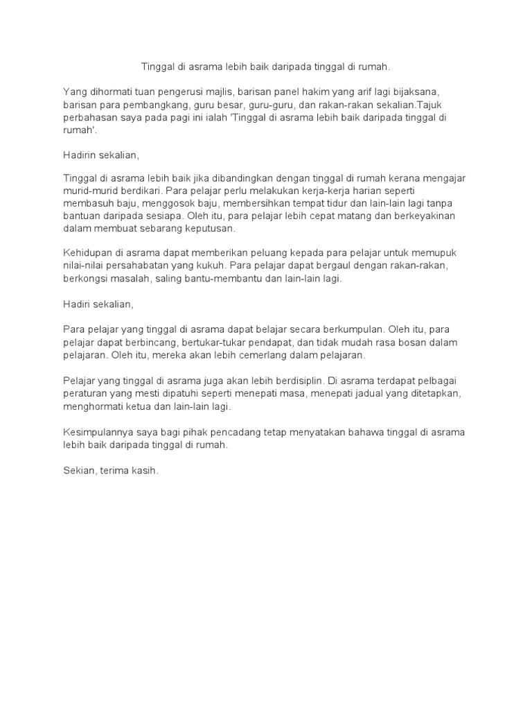 Selain itu, ia menjimatkan masa ibu bapa. Meski begitu saya juga membencinya, karena itu berarti membagi ruang untuk orang lain. Dahulu ayah pun pernah tinggal di asrama. Ketahuilah bahawa banyak kebaikan tinggal di asrama. Antara kelebihan tinggal di asrama: Sebilangan besar universiti dan kolej menyediakan asrama untuk pelajar, tetapi ada juga yang memberi pelajar pilihan untuk tinggal di luar kampus. Kalau saya bisa memilih, mungkin saya lebih ingin terus tinggal di asrama daripada di tempat kos lain. Antara yang dipilih adalah pelajar miskin dan pelajar cemerlang. Kamu memasuki pertandingan perbahasan yang bertajuk 'tinggal di asrama lebih baik daripada tinggal di rumah'. Ada keunggulan yang akan anda rasakan ketika anda tinggal di asrama pesantren. Masa tahun 2000 shida tinggal di asrama yang sepenuhnya hanya perempuan sahaja. Tinggal di asrama baik,namun ada keburukannya.perbezaan latar belakang serta personaliti, akan menyebabkan pelajar gagal menyesuaikan diri serta menimbulkan jurang. Jauh di utara semenanjung di maktab perguruan persekutuan pulau pinang(m4p) (6 disember 1993), baru 6 hari abah ayah meninggal dunia.